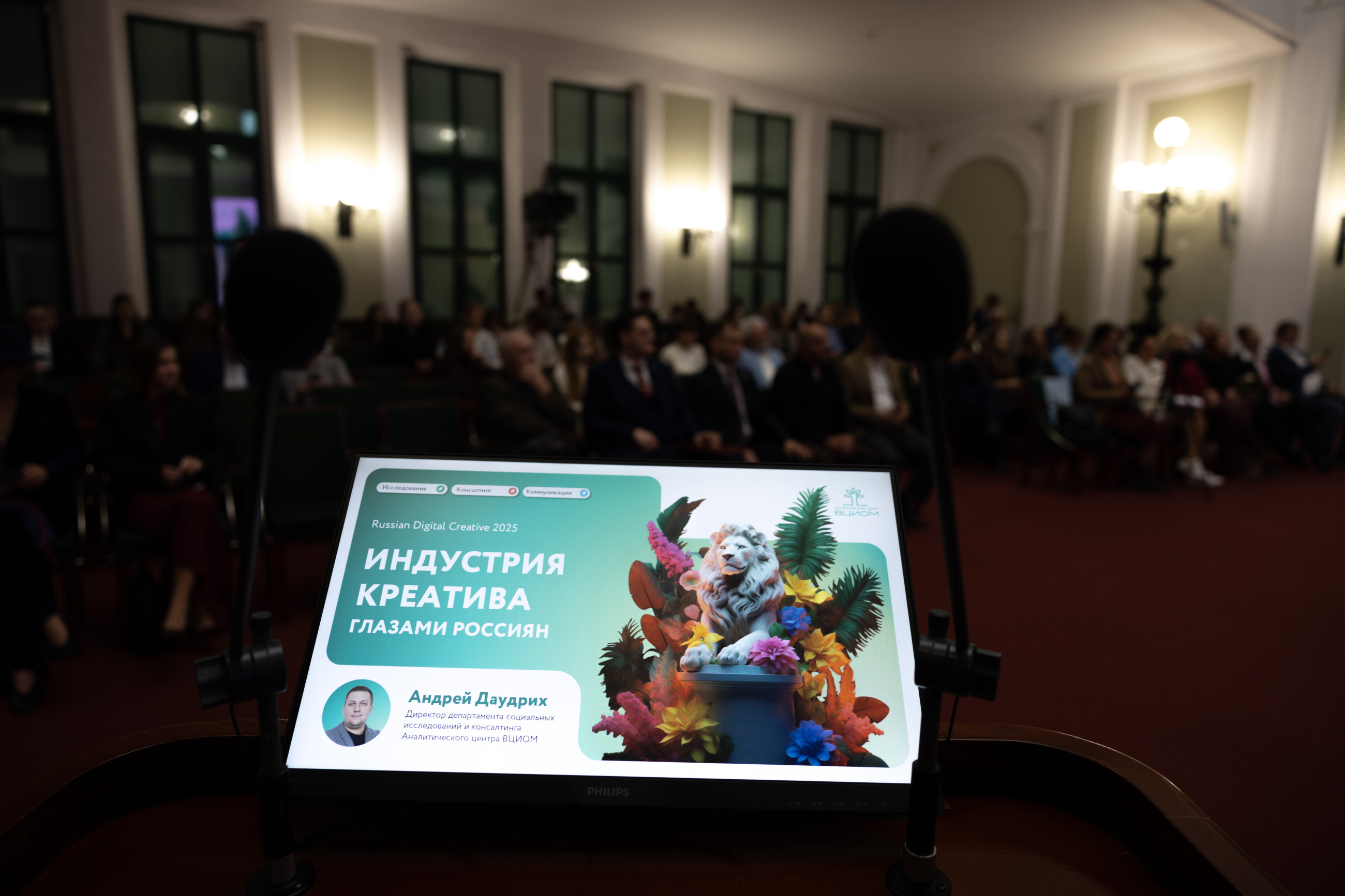 Исследовательскую часть Сессии представили председатель Совета Торгово-промышленной палаты Российской Федерации по креативным индустриям, руководитель лаборатории креативных индустрий Московской школы управления «Сколково» Лидия Рой и директор департамента социальных исследований и консалтинга Всероссийского центра изучения общественного мнения (ВЦИОМ), член экспертного совета по цифровой грамотности и кибер-гигиене при АНО «Цифровая экономика» Андрей Даудрих.